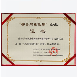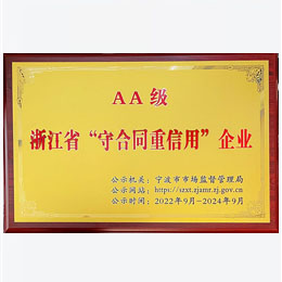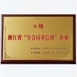 2018年經(jīng)寧波市北侖區(qū)市場(chǎng)監(jiān)督管理局推薦,被寧波市精神文明建設(shè)指導(dǎo)委員會(huì)、寧波市市場(chǎng)監(jiān)督管理局、寧波市民營(yíng)企業(yè)協(xié)會(huì)聯(lián)合評(píng)選認(rèn)定為寧波市誠(chéng)信民營(yíng)企業(yè)稱(chēng)號(hào)。2020年被寧波市北侖區(qū)市場(chǎng)監(jiān)督管理局授予浙江省A級(jí)守合同重信用企業(yè)。2022年經(jīng)寧波市北侖區(qū)市場(chǎng)監(jiān)督管理局推薦,被寧波市市場(chǎng)監(jiān)督管理局授予浙江省AA級(jí)守合同重信用企業(yè)。